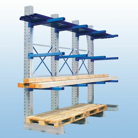 Alle Steherprofile, Füße und Verbindungskreuze werden verzinkt, die Kragarme blau RAL5015 pulverbeschichtet geliefert