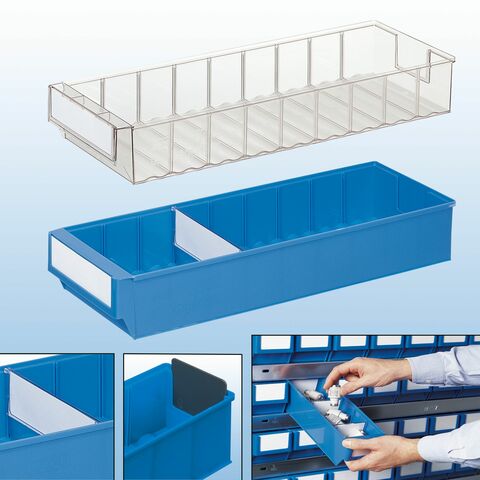 Trennwände sind voll transparent und besitzen ein gleich großes Etikettenfeld wie die Lagerbox. (als Zubehör erhältlich)