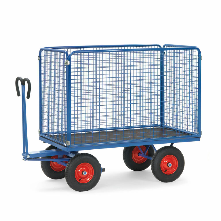 Die rutschsichere Siebdruckplatte aus wasserfestem Sperrholz bildet eine stabile Ladefläche. Längswände sind einhängbar und herausnehmbar, die Stirnwände fest verschraubt. Mit Tragkräften von 750 bis 1250 kg eignen sich die Wagen auch für schwere Lasten.