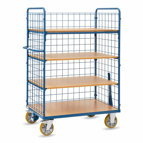 Dieser Etagenwagen ist mit 4 Ebenen ausgestattet, von denen 3 variabel einsetzbar sind, sodass Sie den Stauraum individuell anpassen können.Die Stirnseiten sind durch ein stabiles Drahtgitter begrenzt, die Rückseite ist mit einer Drahtgitter Längswand geschlossen, was für zusätzliche Sicherheit und Stabilität sorgt.